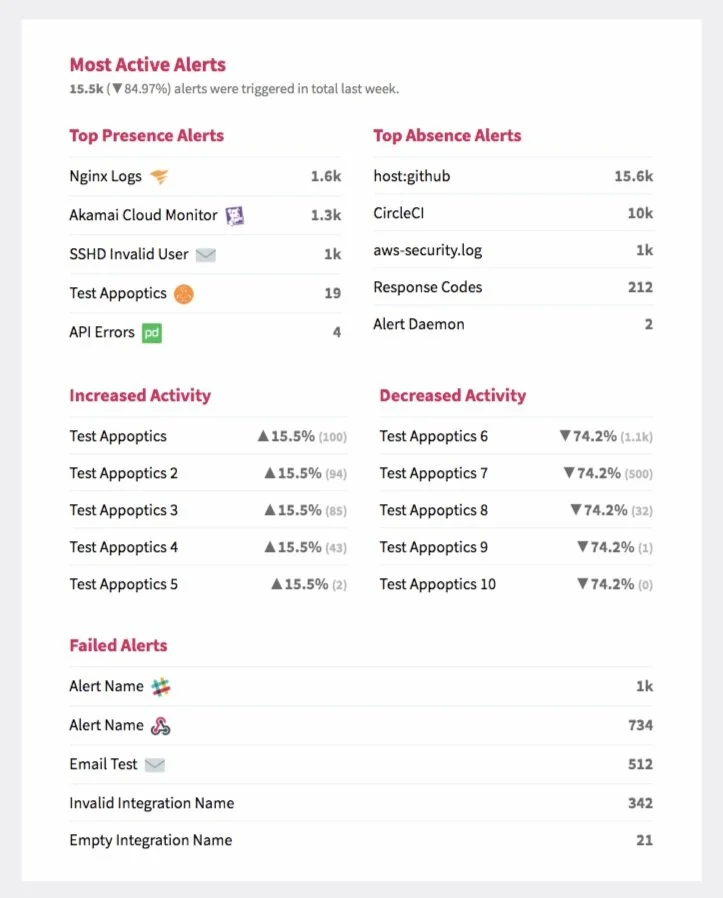 As a Security Officer, you can leverage LogDNA alerts as a form of threat detection. With the right alerts set, you can be notified of unusual activity in your system. Alert Insights is a summary of alerts that have been triggered in the last week or month for you to review to ensure you haven’t missed any important alerts, such as failed logins, attempted logins, root logins, etc. If you see many attempted or failed logins, it is important to know so you can investigate.