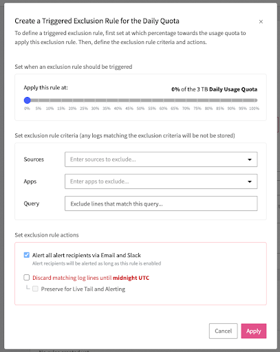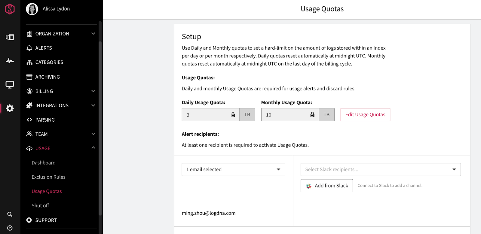 For both hard and soft quotas, LogDNA requires that you set up notification rules to ensure that the appropriate team members are aware when you hit hard quotas, or when exclusion rules are triggered through soft quotas. This is set up within the Usage Quotas menu item in your LogDNA account (Settings>Usage>Usage Quotas), and includes integrations with email and Slack.