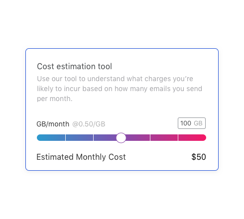 In the metering section, you can see the UI is simple. We’re letting the users know the rate per x item used and showing a cost estimator so users can gauge how much money they would be spending at the end of the month. The goal is to be as transparent as possible without overwhelming them with information.