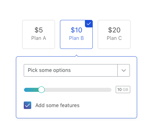 After five iterations between product and design, we ended up with following UI for metered based billing as well as plans with customizable features.