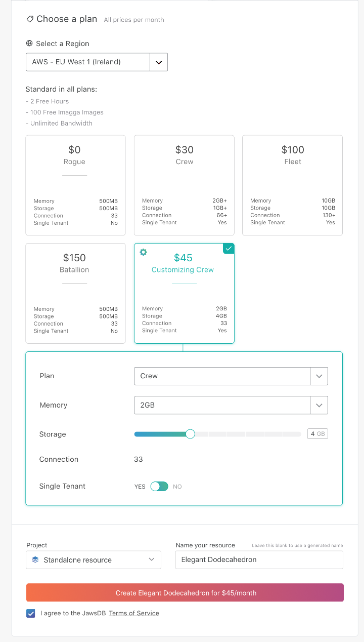 We’ve included a check box for scenarios where a user wants additional add-on features (a replica database for JawsDB’s use case). Massive shoutout to Meg Smith for the product design work.?